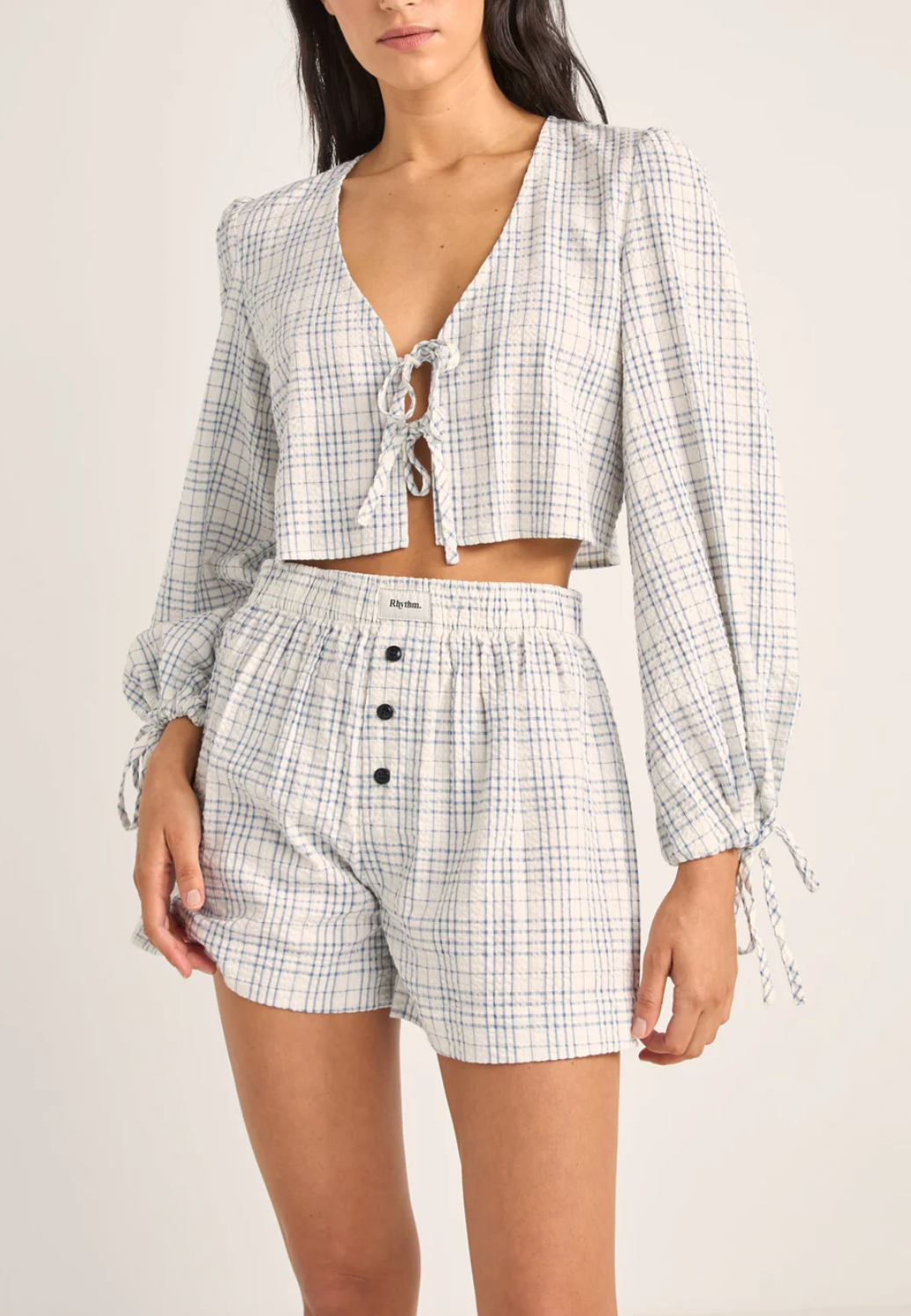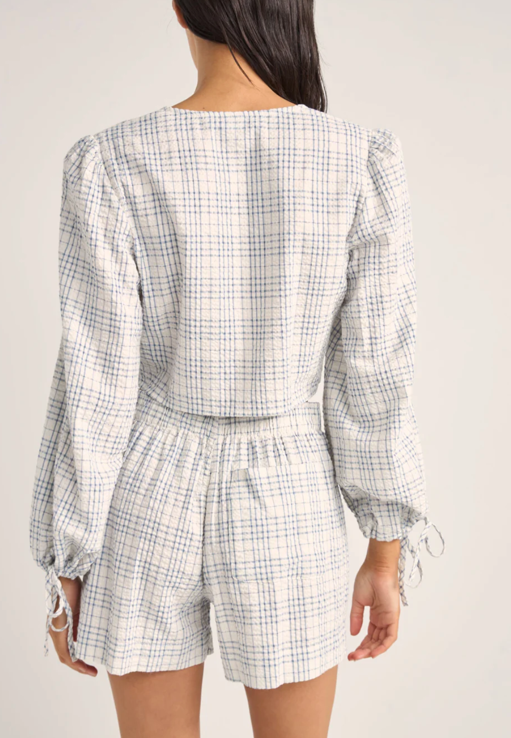 The Desi Plaid Blouson Top in Blue perfectly blends elegance and comfort. Made from textured check fabric, it features ties and volume sleeves. Lightweight with a soft hand feel, this top is great for sunlit days, beach outings, and artistic events, adding a touch of charm to any outfit.